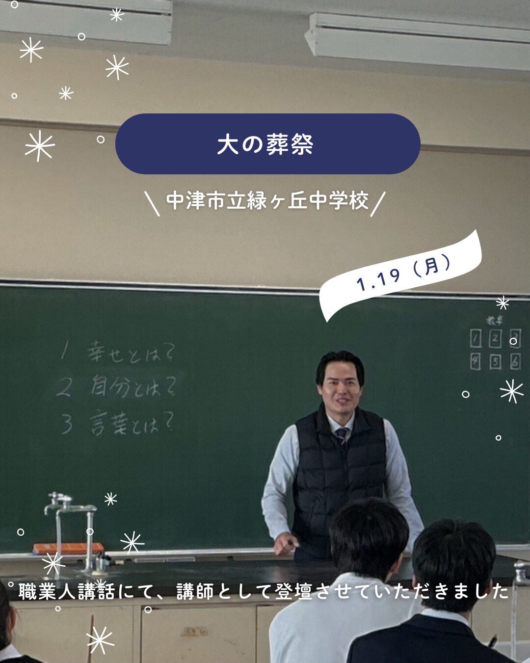 1月19日(月)中津市立緑ヶ丘中学校にて、職業人講話の講師として、弊社社長が登壇させていただきました。 当日は、生き方や仕事について、中学生の皆さんにお話しする貴重な時間をいただきました。 &…【・・・続きを読む】