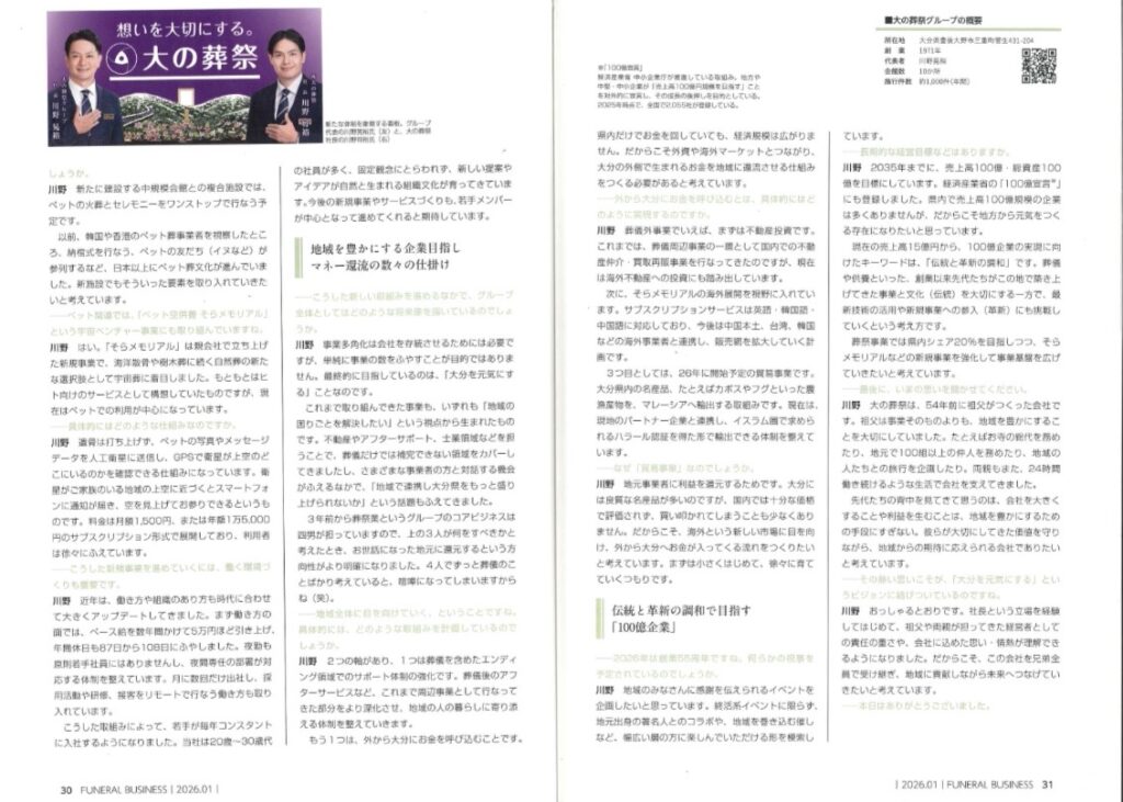 月刊『FUNERAL BUSINESS』特集「事業展望2026 ― 注目の経営者に聞く」 において、当社代表のインタビュー記事が掲載されています。